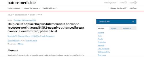 11月4日,国际四大医学期刊之一、英国《自然》旗下《自然医学》(Nature Medicine)在线发表CDK4/6抑制剂达尔西利(SHR6390)联合氟维司群治疗既往内分泌治疗后疾病进展的HR+/HER2-晚期乳腺癌的多中心、随机、双盲III期临床研究(DAWNA-1研究)中期分析结果报告,首次对氟维司群(雌激素受体降解剂)±达尔西利治疗激素受体阳性晚期乳腺癌的有效性和安全性进行了比较。研究结果显示,达尔西利+氟维司群组与安慰剂+氟维司群组相比,无进展生存期(PFS)显著延长。该项研究由中国医学科学院肿瘤医院徐兵河教授担任leading PI,全国39家医院参研,由尊龙凯时人生就是博医药临床研发团队支持完成。