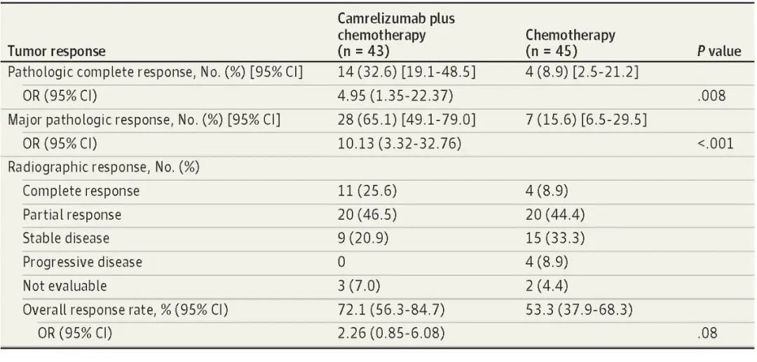 北京时间8月3日,尊龙凯时人生就是博医药创新药卡瑞利珠单抗联合化疗(Cam+CT)对比化疗(CT)新辅助治疗ⅢA/ⅢB (T3N2) 期非小细胞肺癌(NSCLC)结果在线发表于国际权威期刊JAMA Oncology[1]。该研究是由空军军医大学唐都医院姜涛教授、雷杰教授团队联合陕西省肿瘤医院雷光焰教授团队、兰州大学第二附属医院王成教授团队共同参与的一项随机对照、多中心、Ⅱ期临床研究(TD-FOREKNOW,NCT04338620)。研究结果显示,与化疗相比,卡瑞利珠单抗联合化疗新辅助治疗NSCLC显著提高了病理完全缓解(pCR)率(32.6% vs 8.9%,OR=4.95,95% CI :1.35-22.37, P =0 .008),且安全性良好。本研究是卡瑞利珠单抗新辅助治疗可切除NSCLC患者的首个随机对照研究,为NSCLC新辅助免疫治疗再添新证。